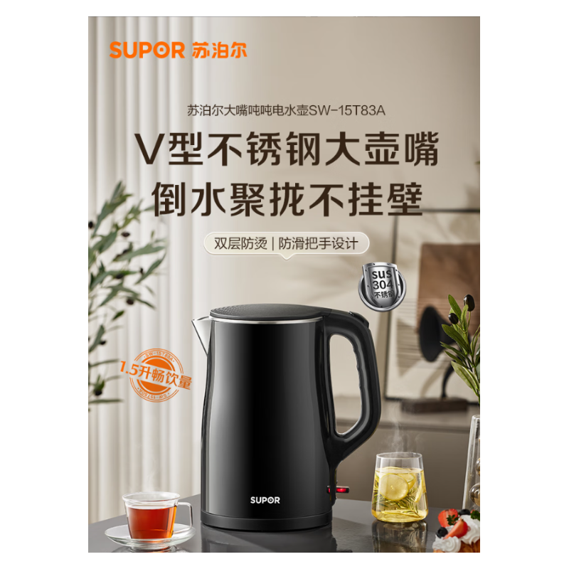 苏泊尔 SW-15T83A 304不锈钢电热水壶1.5L小容量
